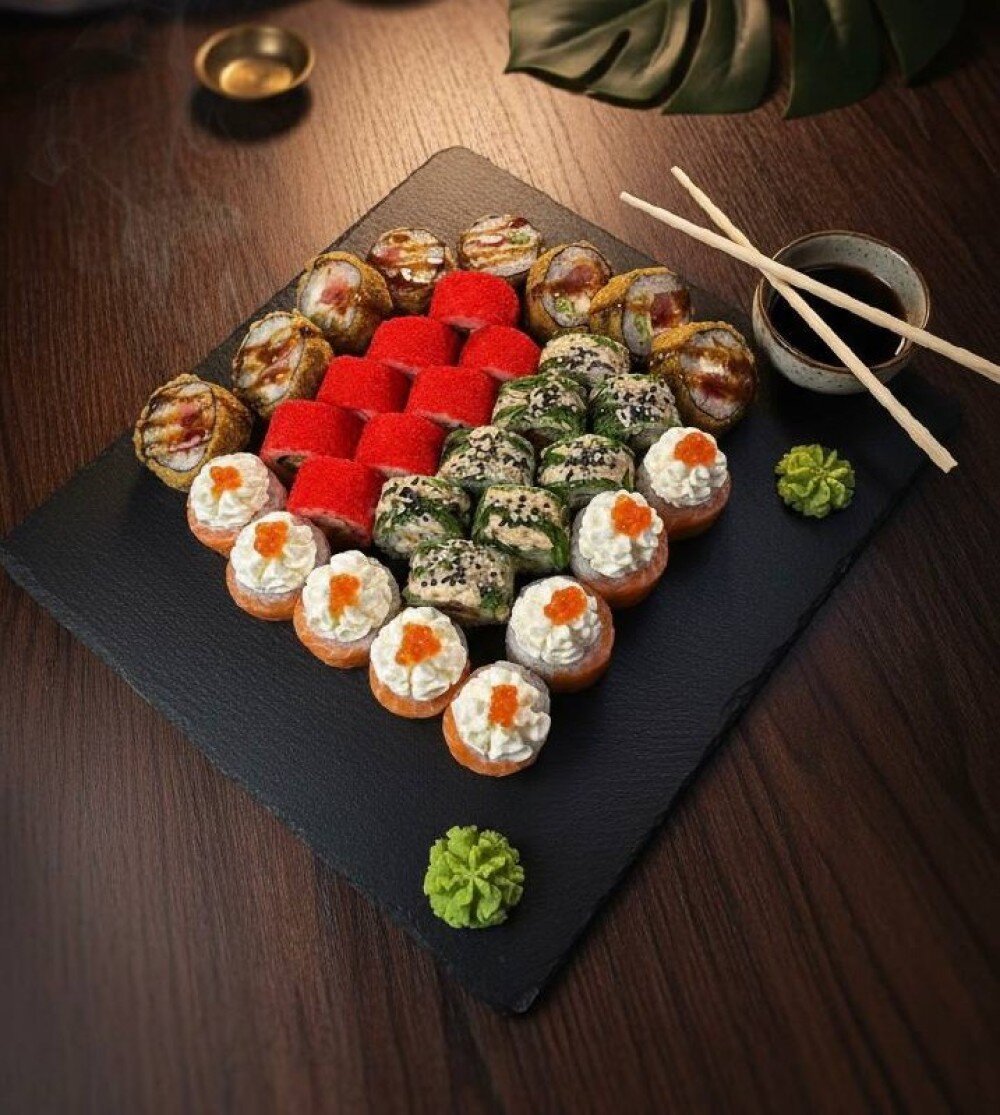 Филадельфия VIP (нори, рис, творожный сыр, авокадо, лосось, икра), Ролл Green (нори, рис, творожный сыр, креветки, копченный лосось, чука, ореховый соус, кунжут), Фьюжн (нори, рис, тунец, креветки, огурец, икра тобико), Темпура с тунцом (нори, рис, спайси соус, творожный сыр, тунец, такуан, салат айсберг, соус терияке)