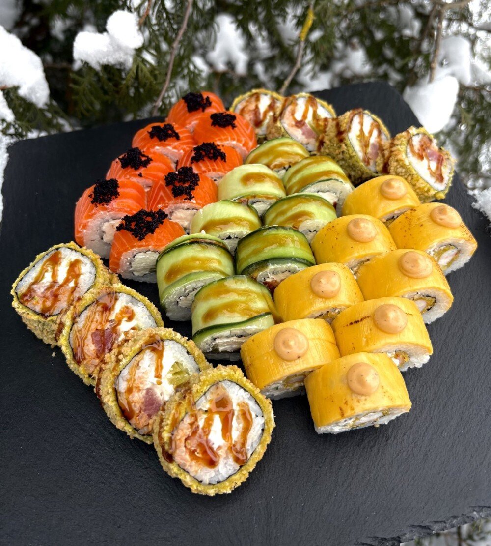 Филадельфия с черной икрой, Ролл Чеддер Гриль (нори, рис, творожный сыр, креветка темпура, огурец, чеддер, соус гриль), Фреш ролл (нори, рис, творожный сыр, лосось копченный, такуан, огурец,соус терияки), Темпура с тунцом (нори, рис, творожный сыр, соус спайс, тунец, айсберг, такуан, темпура, соус терияки)
